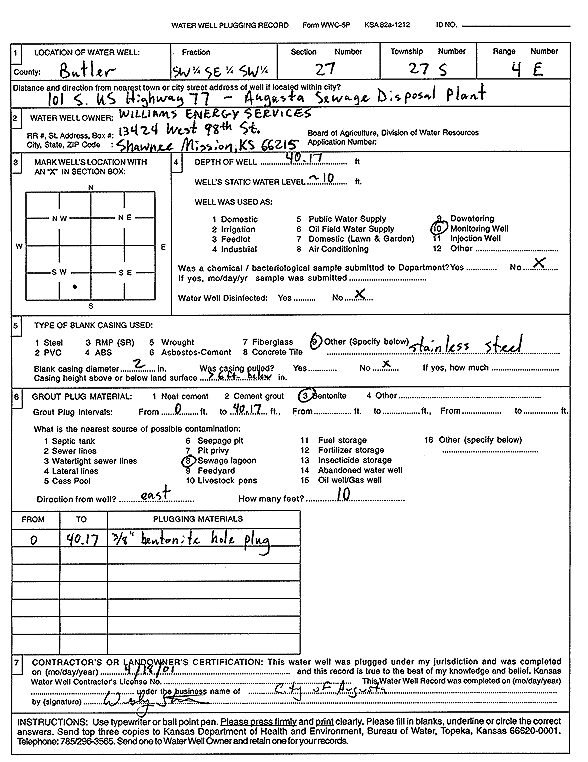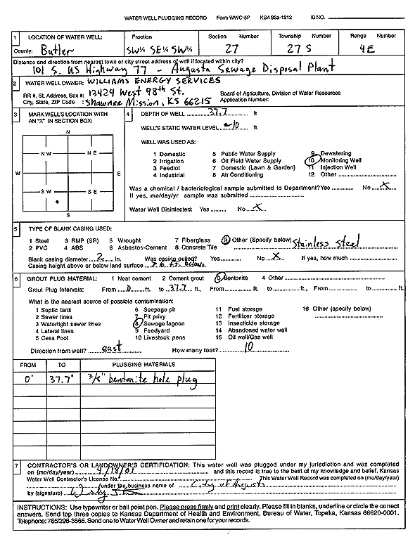 Williams Energy Services | 37.7 ft. | 10 ft. | Monitoring well/observation/piezometer | Plugged | 18-Apr-2001 | Scan | ||