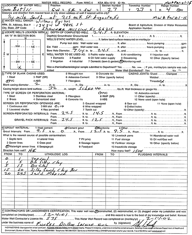 Williams Pipeline Co. | 24.5 ft. | Monitoring well/observation/piezometer | MW FAR 01-1-S | Constructed | 04-Dec-2001 | Scan | ||