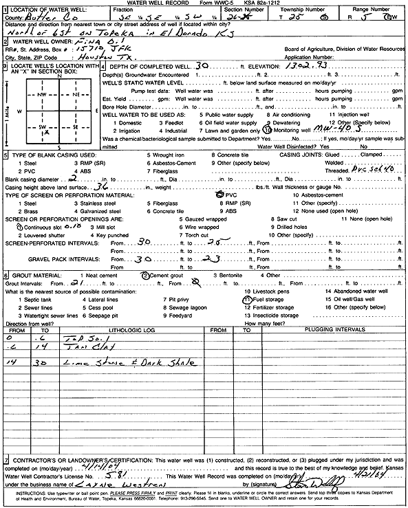 FINA Oil | 30 ft. | Monitoring well/observation/piezometer | MW 40S | Constructed | 14-Apr-2004 | Scan | ||