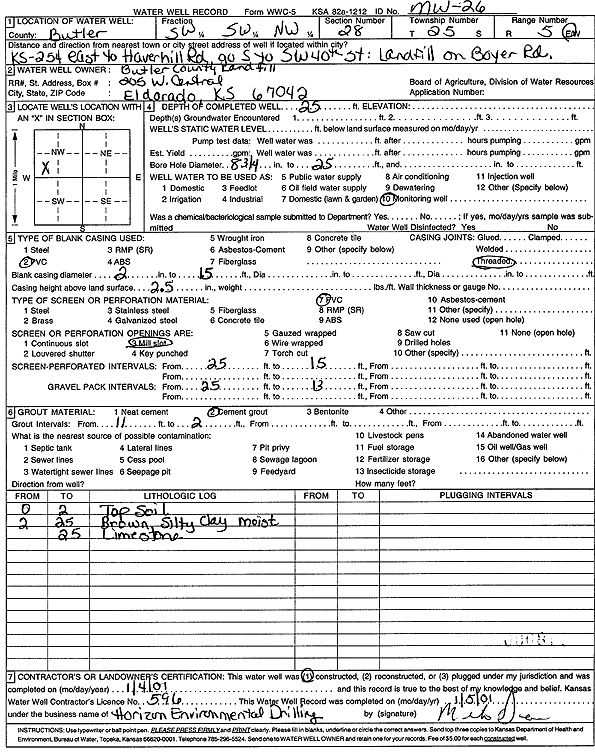 Butler County Landfill | 25 ft. | Monitoring well/observation/piezometer | MW 26 | Constructed | 04-Jan-2001 | Scan | ||