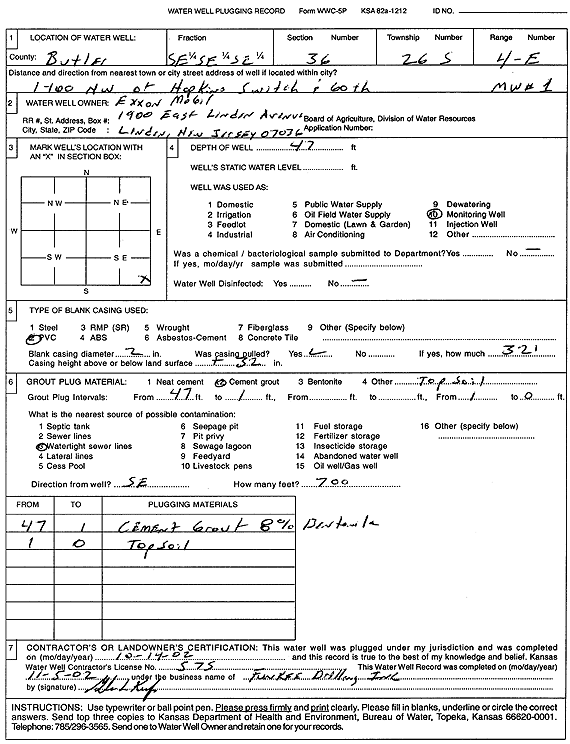 Exxon Mobil | 47 ft. | Monitoring well/observation/piezometer | MW 1 | Plugged | 14-Oct-2002 | Scan | ||
