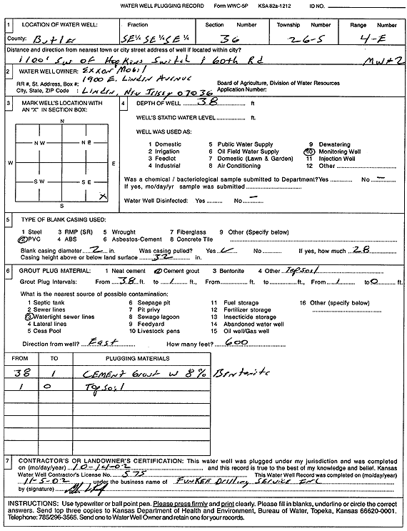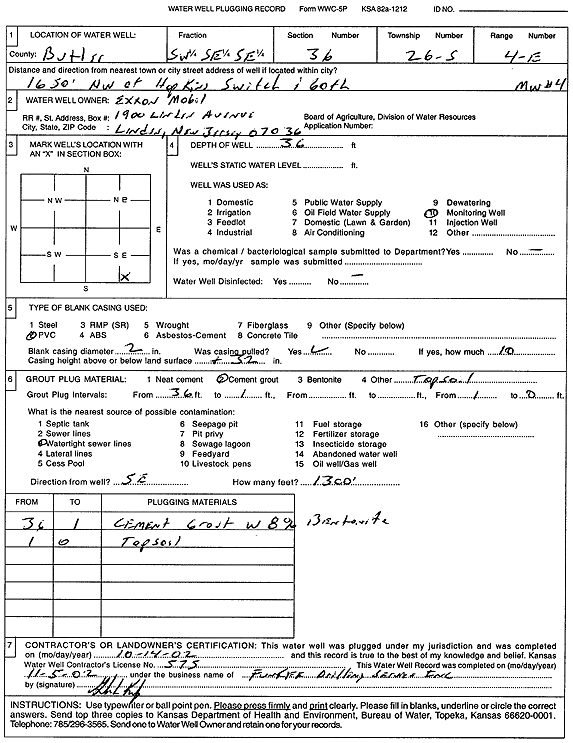 Exxon Mobil | 36 ft. | Monitoring well/observation/piezometer | MW 4 | Plugged | 14-Oct-2002 | Scan | ||