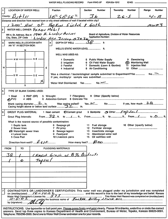Exxon Mobil | 38 ft. | Monitoring well/observation/piezometer | MW 3 | Plugged | 14-Oct-2002 | Scan | ||