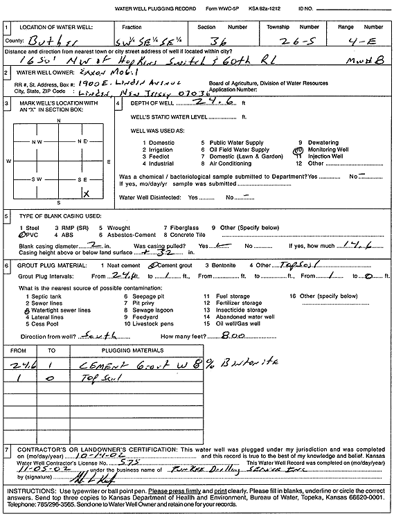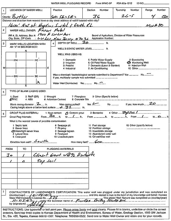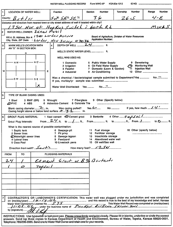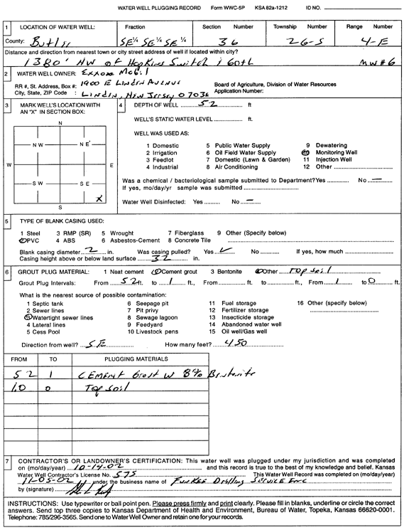 Exxon Mobil | 24 ft. | Monitoring well/observation/piezometer | MW 5 | Plugged | 14-Oct-2002 | Scan | ||