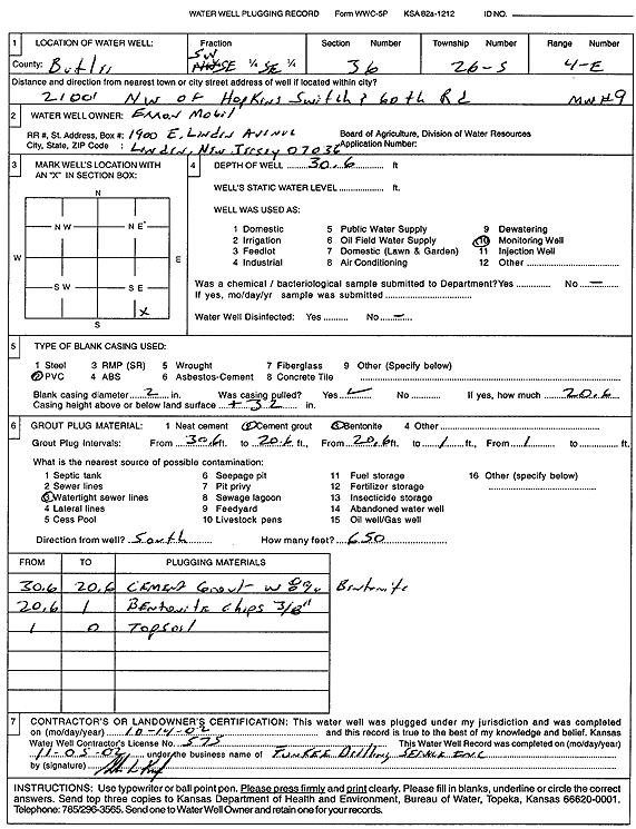 Badwey, Nick | 20 ft. | Monitoring well/observation/piezometer | MW 7 | Plugged | 07-Aug-2001 | Scan | ||
