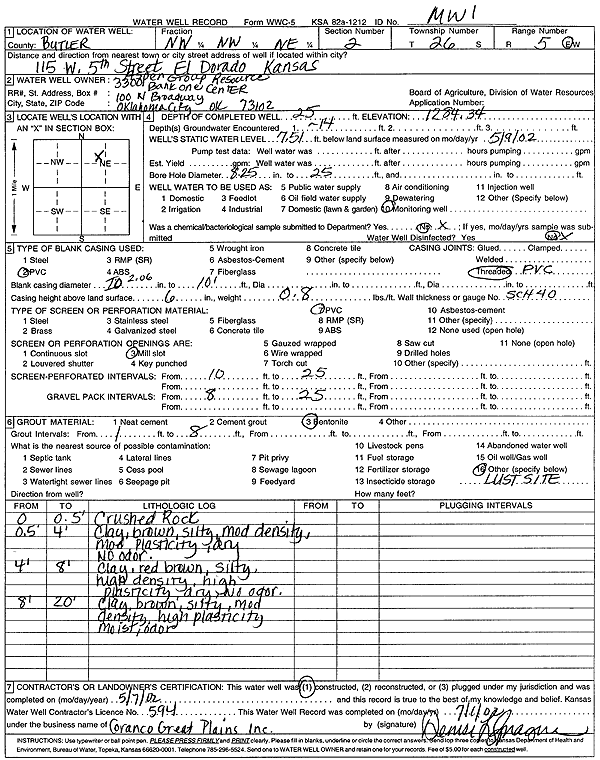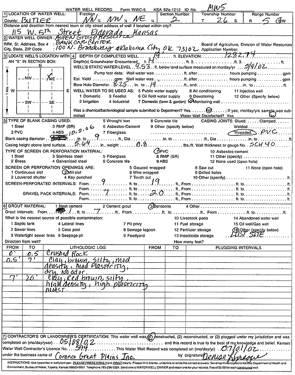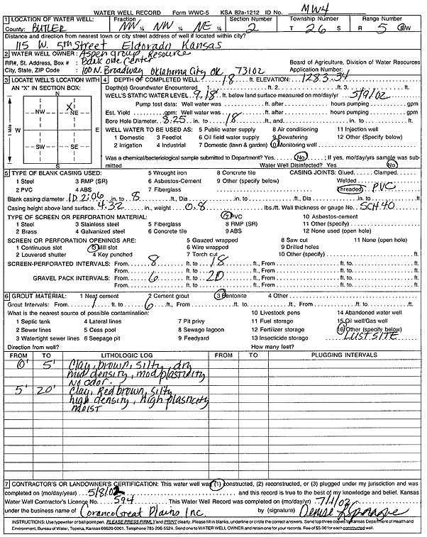 Aspen Group Resource | 19 ft. | 9.53 ft. | Monitoring well/observation/piezometer | MW 5 | Constructed | 08-May-2002 | Scan | |