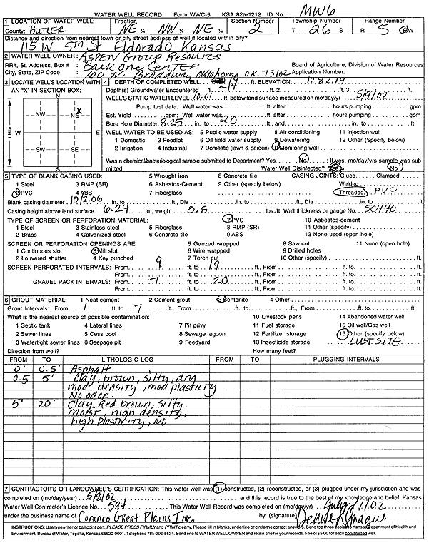 Aspen Group Resource | 19 ft. | 10.01 ft. | Monitoring well/observation/piezometer | MW 6 | Constructed | 08-May-2002 | Scan | |