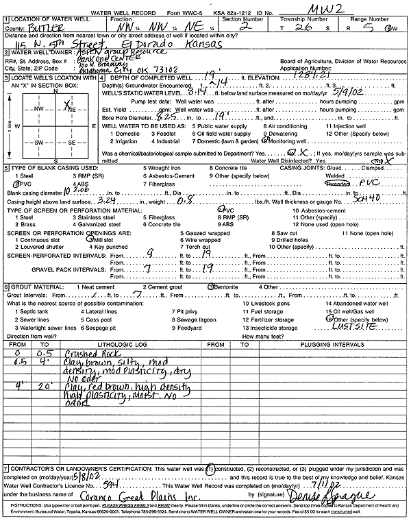 Aspen Group Resource | 19 ft. | 8.14 ft. | Monitoring well/observation/piezometer | MW 2 | Constructed | 08-May-2002 | Scan | |