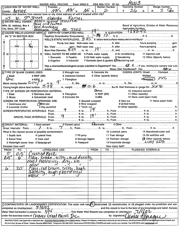 Aspen Group Resource | 19 ft. | 8.85 ft. | Monitoring well/observation/piezometer | MW 3 | Constructed | 08-May-2002 | Scan | |