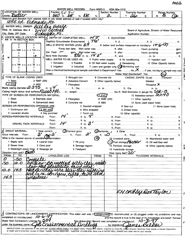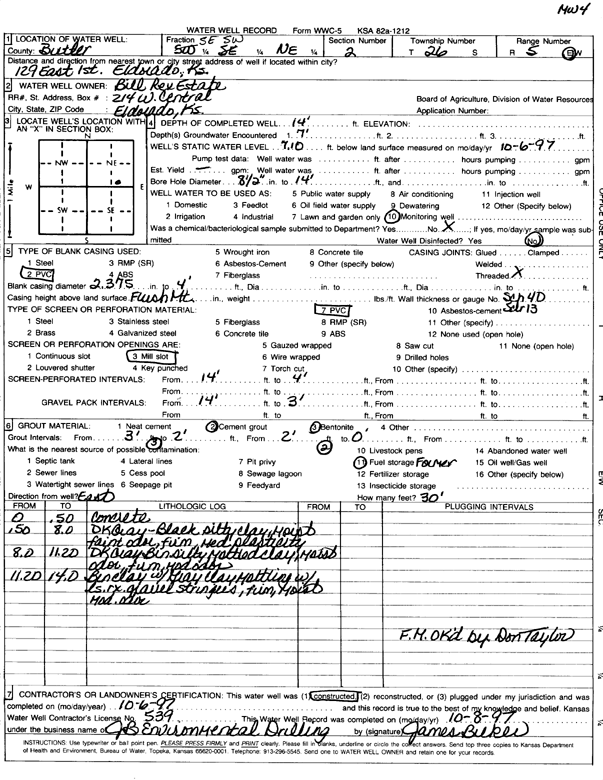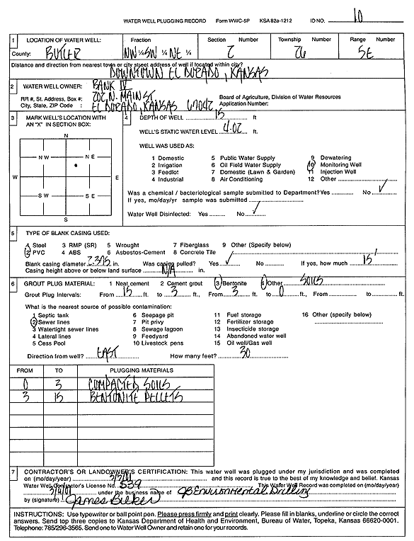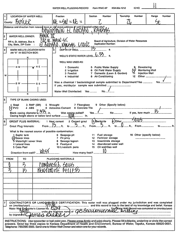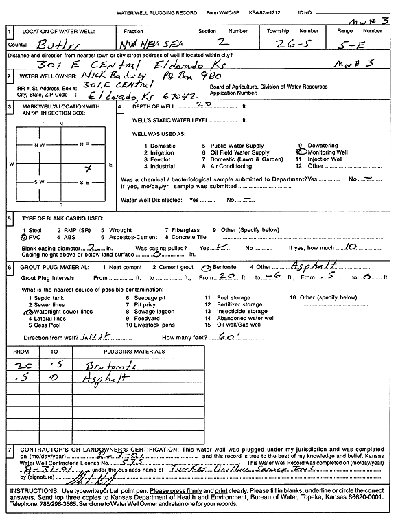 City of El Dorado | 14 ft. | 6.98 ft. | Monitoring well/observation/piezometer | MW 12 | Plugged | 05-Mar-2001 | Scan | |