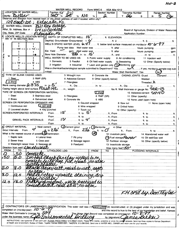 City of El Dorado | 10 ft. | 3.79 ft. | Monitoring well/observation/piezometer | Constructed | 15-Sep-1994 | |||