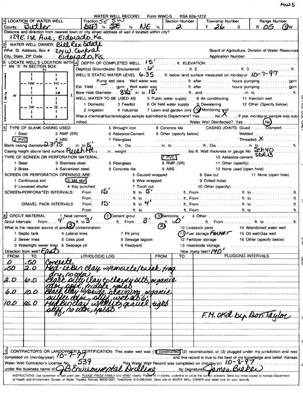 Bill Rex Estate | 15 ft. | 6.35 ft. | Monitoring well/observation/piezometer | MW 5 | Constructed | 07-Oct-1997 | Scan | |
