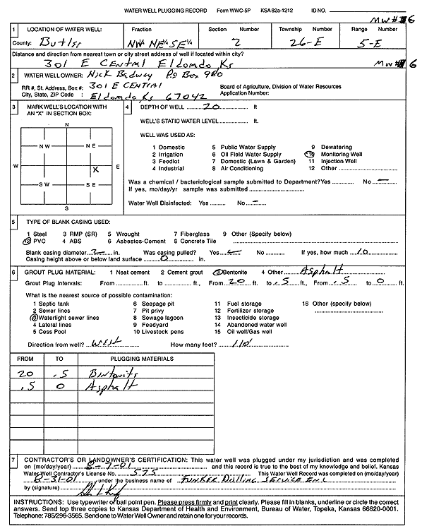 Badwey, Nick | 20 ft. | Monitoring well/observation/piezometer | MW 6 | Plugged | 07-Aug-2001 | Scan | ||