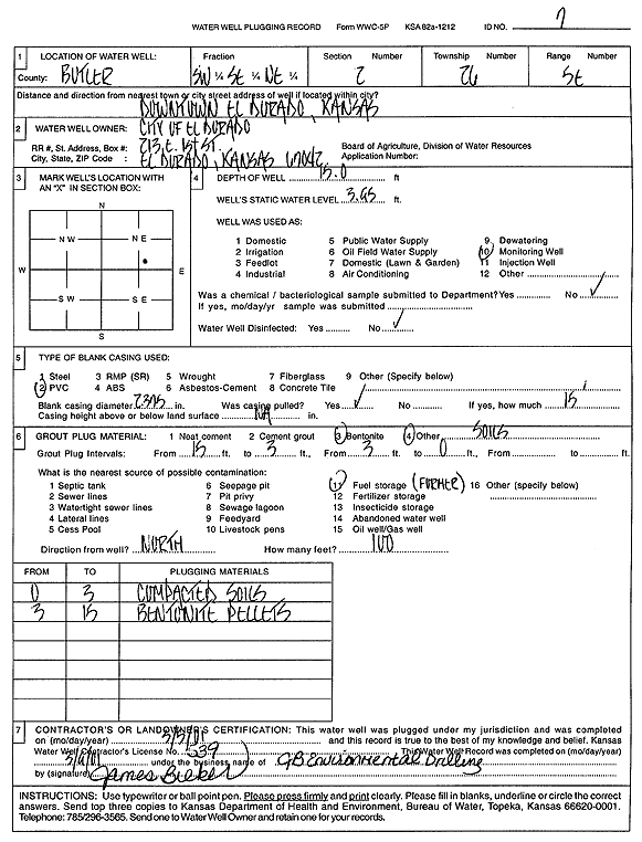 City of El Dorado | 15 ft. | 3.95 ft. | Monitoring well/observation/piezometer | MW 7 | Plugged | 05-Mar-2001 | Scan | |