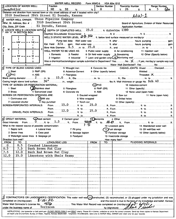 Chase Pipeline Co. | 25 ft. | 25.36 ft. | Monitoring well/observation/piezometer | MW 1 | Constructed | 16-Aug-2002 | Scan | |