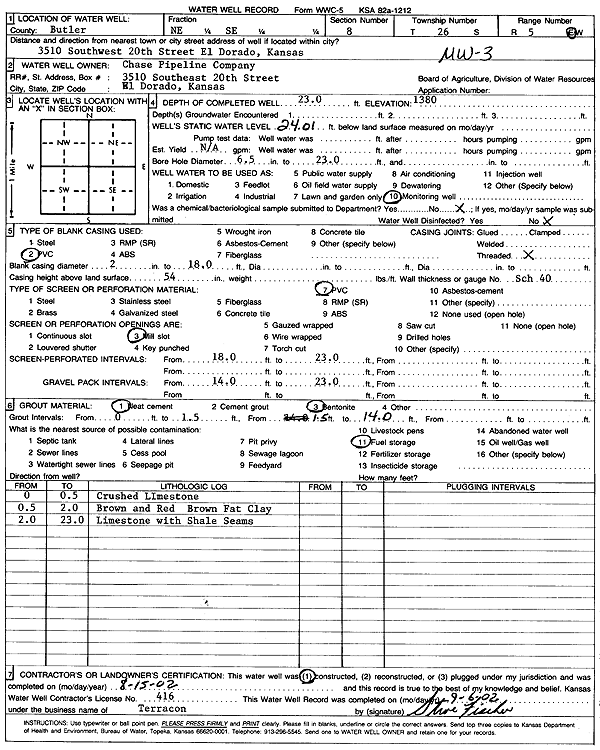 Chase Pipeline Co. | 23 ft. | 24.01 ft. | Monitoring well/observation/piezometer | MW 3 | Constructed | 15-Aug-2002 | Scan | |