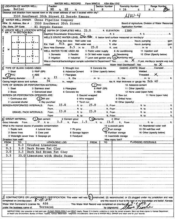 Chase Pipeline Co. | 25 ft. | 26.56 ft. | Monitoring well/observation/piezometer | MW 4 | Constructed | 15-Aug-2002 | Scan | |