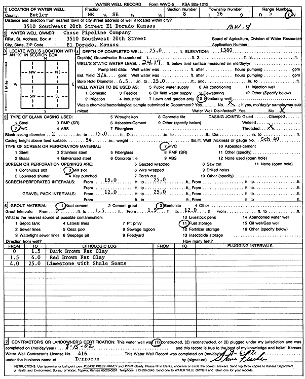 Chase Pipeline Co. | 25 ft. | 24.17 ft. | Monitoring well/observation/piezometer | MW 8 | Constructed | 15-Aug-2002 | Scan | |
