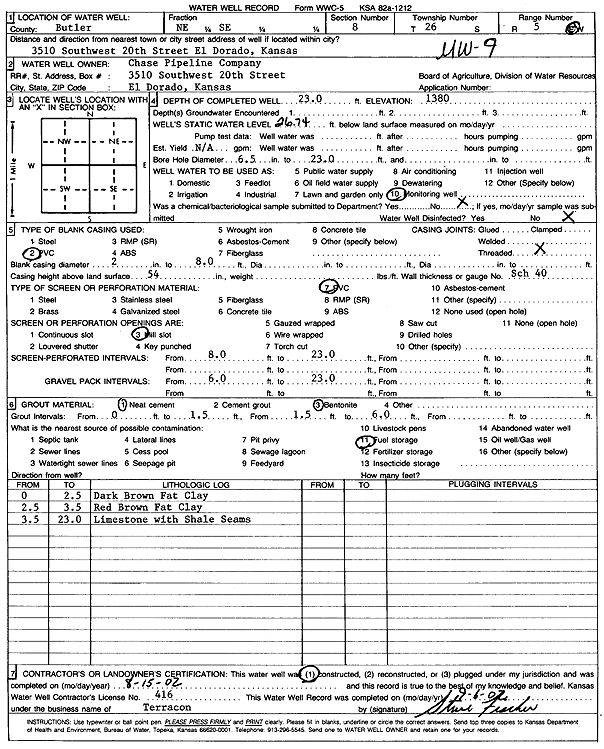 Chase Pipeline Co. | 23 ft. | 26.74 ft. | Monitoring well/observation/piezometer | MW 9 | Constructed | 15-Aug-2002 | Scan | |