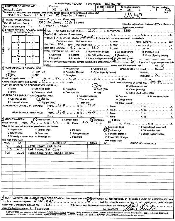 Chase Pipeline Co. | 22 ft. | 20.65 ft. | Monitoring well/observation/piezometer | MW 10 | Constructed | 15-Aug-2002 | Scan | |