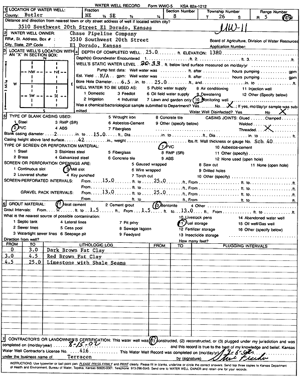 Chase Pipeline Co. | 25 ft. | 20.33 ft. | Monitoring well/observation/piezometer | MW 11 | Constructed | 15-Aug-2002 | Scan | |