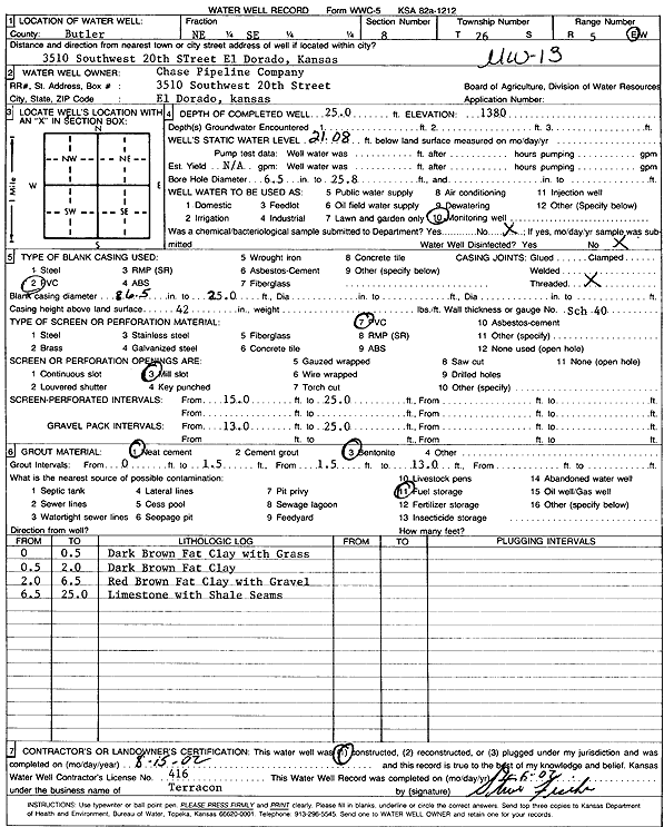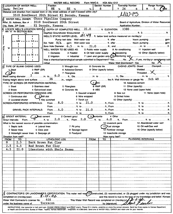 Chase Pipeline Co. | 25 ft. | 21.08 ft. | Monitoring well/observation/piezometer | MW 13 | Constructed | 15-Aug-2002 | Scan | |