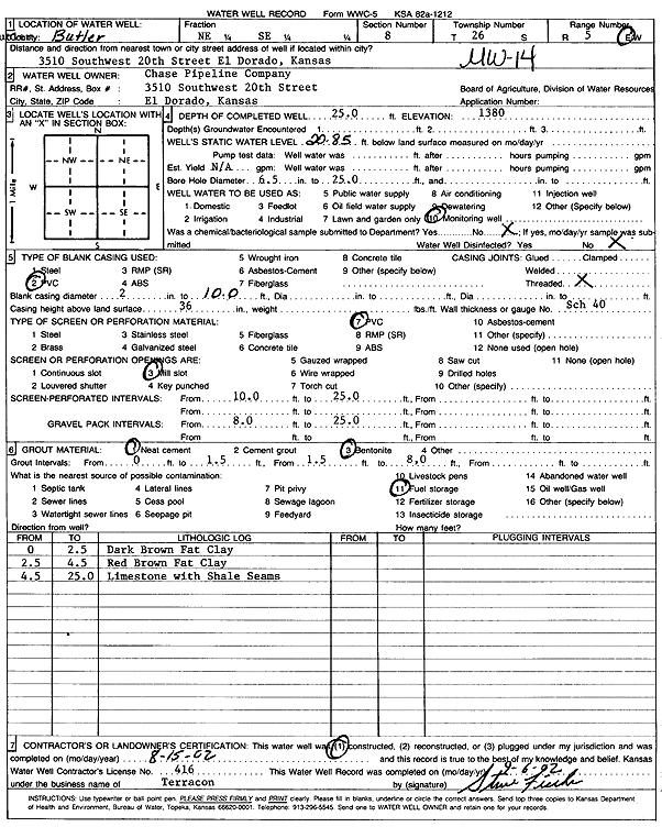 Chase Pipeline Co. | 25 ft. | 20.85 ft. | Monitoring well/observation/piezometer | MW 14 | Constructed | 15-Aug-2002 | Scan | |