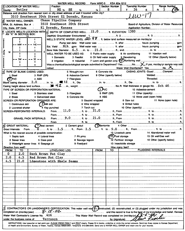 Chase Pipeline Co. | 21 ft. | 20.98 ft. | Monitoring well/observation/piezometer | MW 17 | Constructed | 15-Aug-2002 | Scan | |
