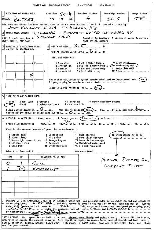 Walmart Corp. | 3.5 ft. | 3 ft. | Monitoring well/observation/piezometer | Plugged | 25-Jun-2004 | Scan | ||