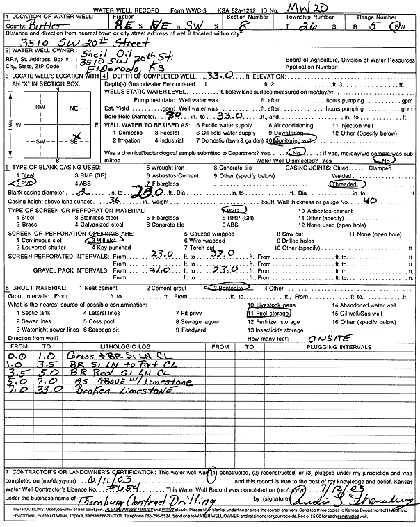 Shell Oil | 33 ft. | Monitoring well/observation/piezometer | MW 20 | Constructed | 11-Jun-2003 | Scan | ||