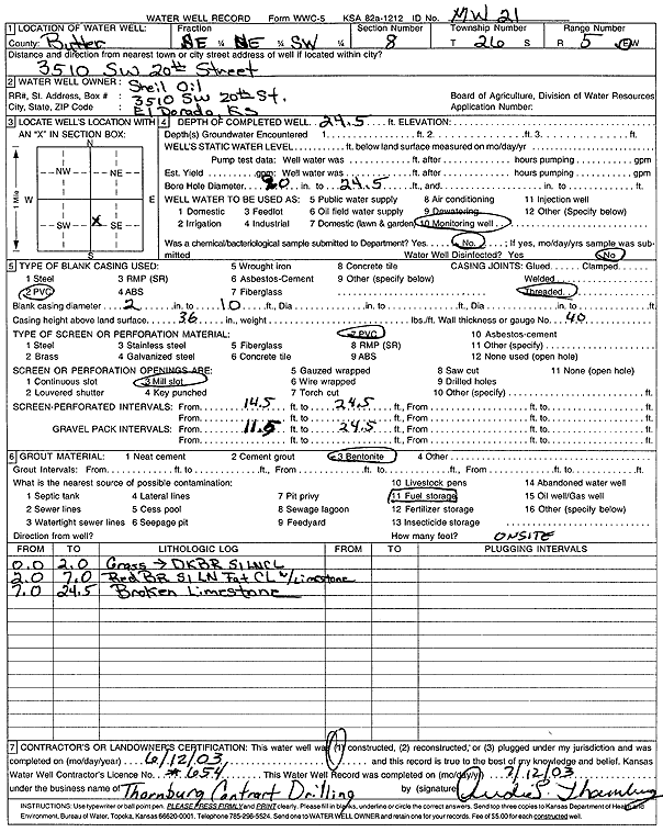 Shell Oil | 24.5 ft. | Monitoring well/observation/piezometer | MW 21 | Constructed | 12-Jun-2003 | Scan | ||