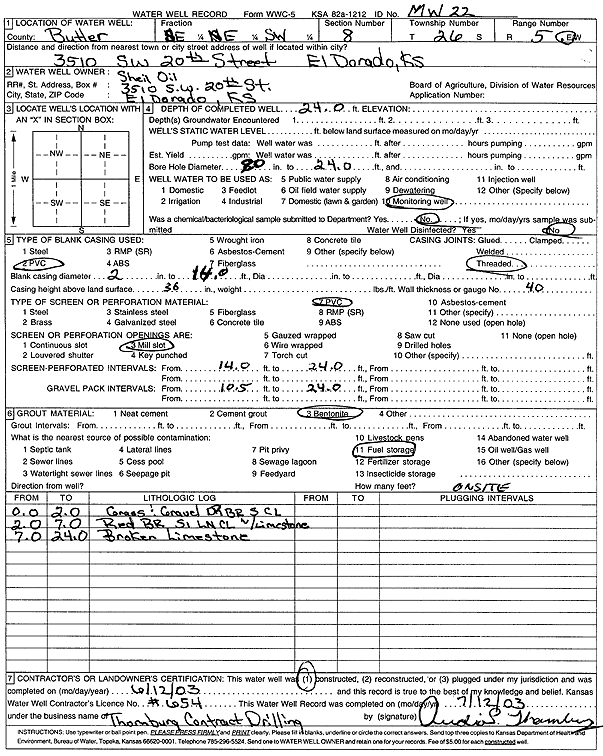 Shell Oil | 24 ft. | Monitoring well/observation/piezometer | MW 22 | Constructed | 12-Jun-2003 | Scan | ||