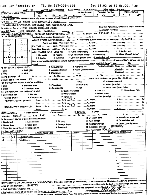 Texaco Refining and Marketing, Inc. | 79.2 ft. | 22 ft. | Monitoring well/observation/piezometer | Well 21 | Plugged | 29-Aug-1994 | Scan | |