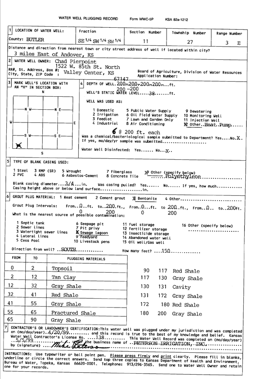 Pierpoint, Chad | 200 ft. | 38 ft. | Heat Pump (Closed Loop/Disposal), Geothermal | Constructed | 20-Apr-1999 | Scan | ||