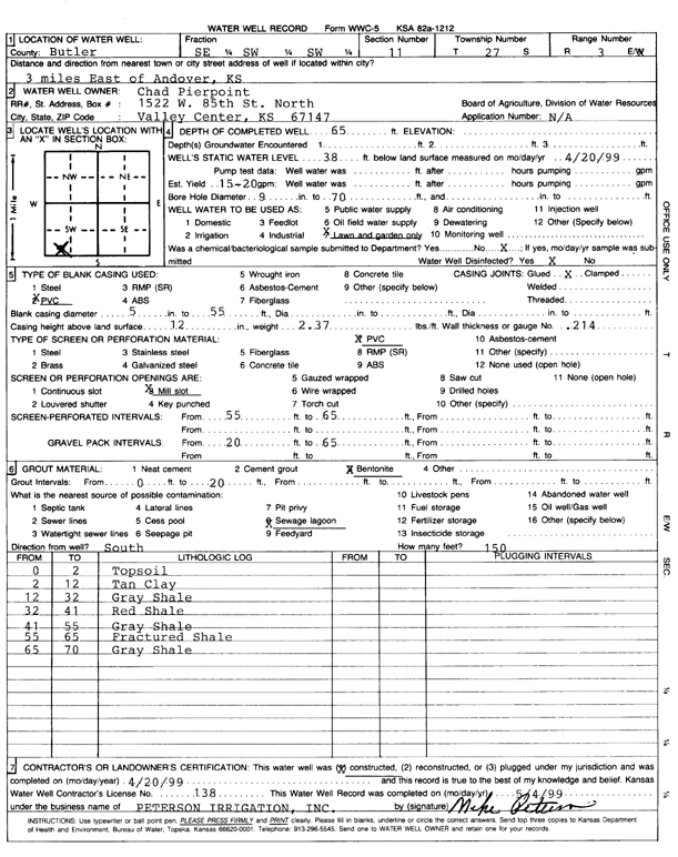 Pierpoint, Chad | 65 ft. | 38 ft. | 17.5 gpm. | Domestic, Lawn and Garden | Constructed | 20-Apr-1999 | Scan | |