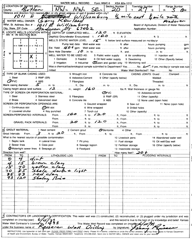 Rowland, Gary | 120 ft. | 15 ft. | 40 gpm. | Domestic, Lawn and Garden | Constructed | 15-Jun-1999 | Scan | |
