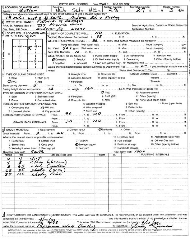 Davidson, Patrick Q. | 110 ft. | 32 ft. | 40 gpm. | Domestic | Constructed | 13-Apr-1999 | Scan | |