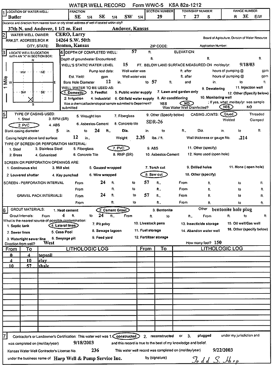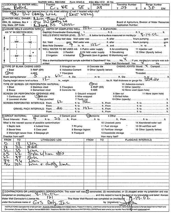 Thompson, Adam | 102 ft. | 32 ft. | Domestic, Lawn and Garden | E well | Constructed | 14-Aug-2002 | Scan | |