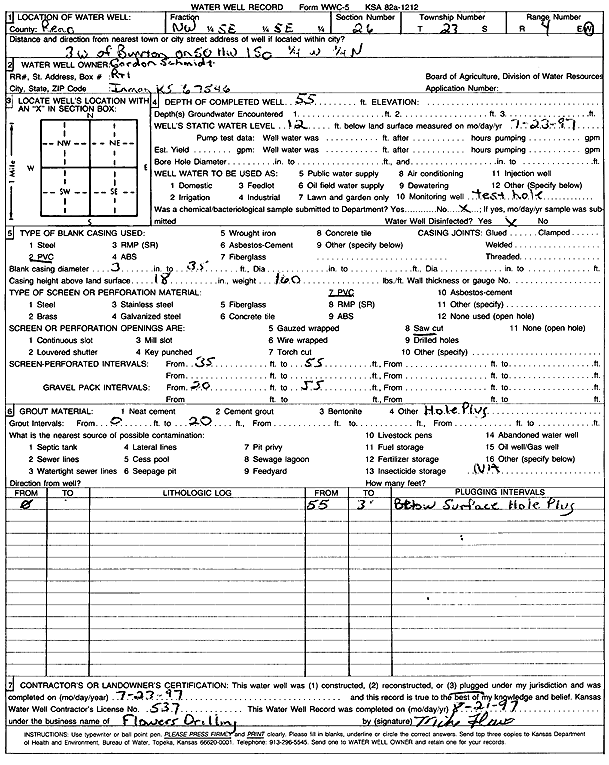 Schmidt, Gordon | 55 ft. | 12 ft. | Test hole/well | Plugged | 23-Jul-1997 | Scan | ||