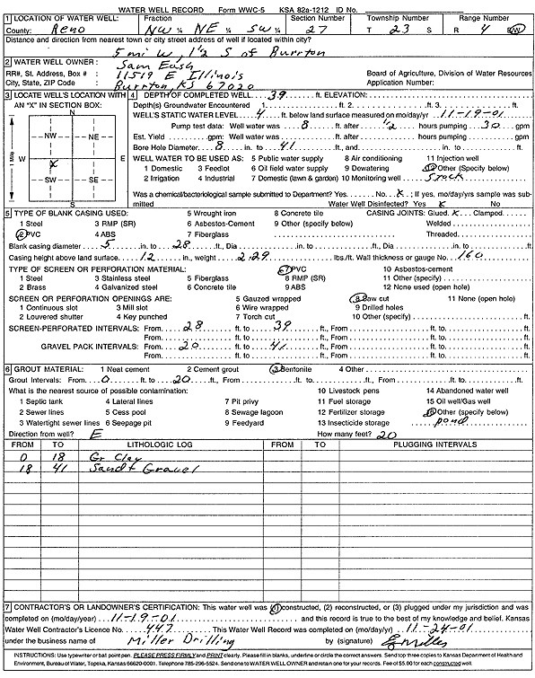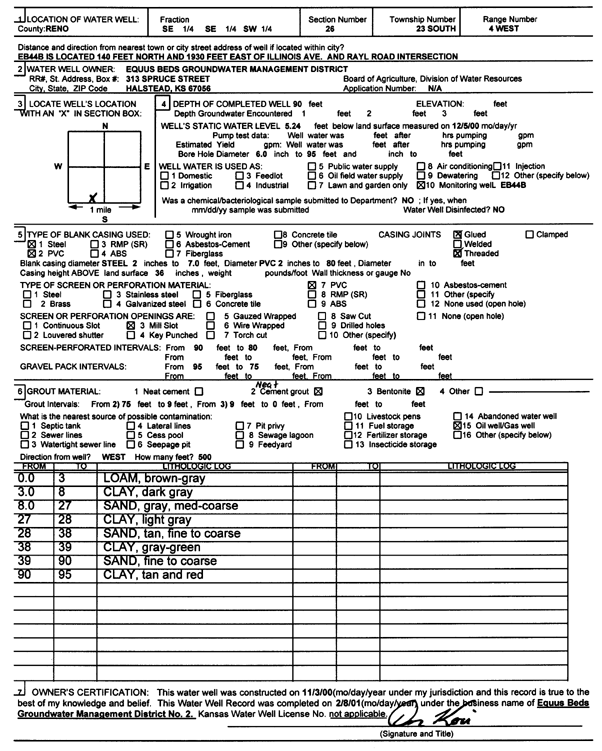 Equus Beds GMD 2 | 90 ft. | 5.24 ft. | Monitoring well/observation/piezometer | EB 44B | Constructed | 03-Nov-2000 | Scan | |