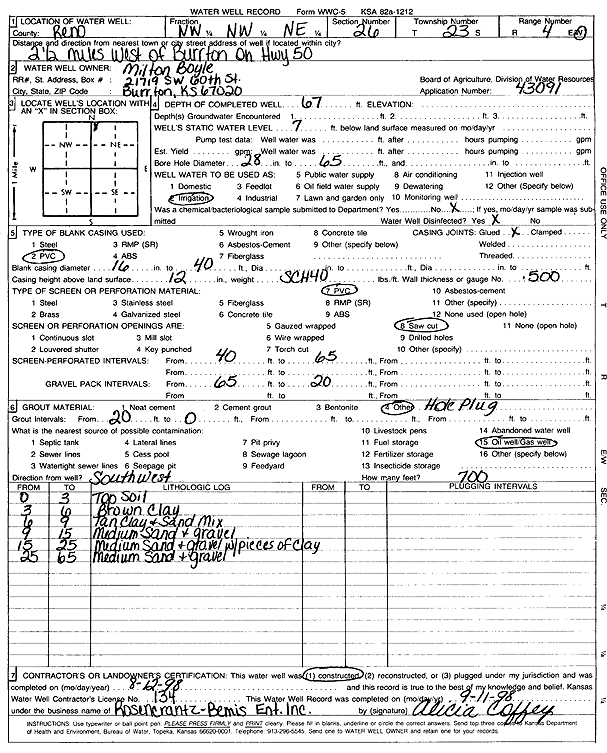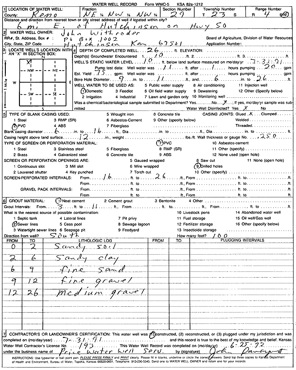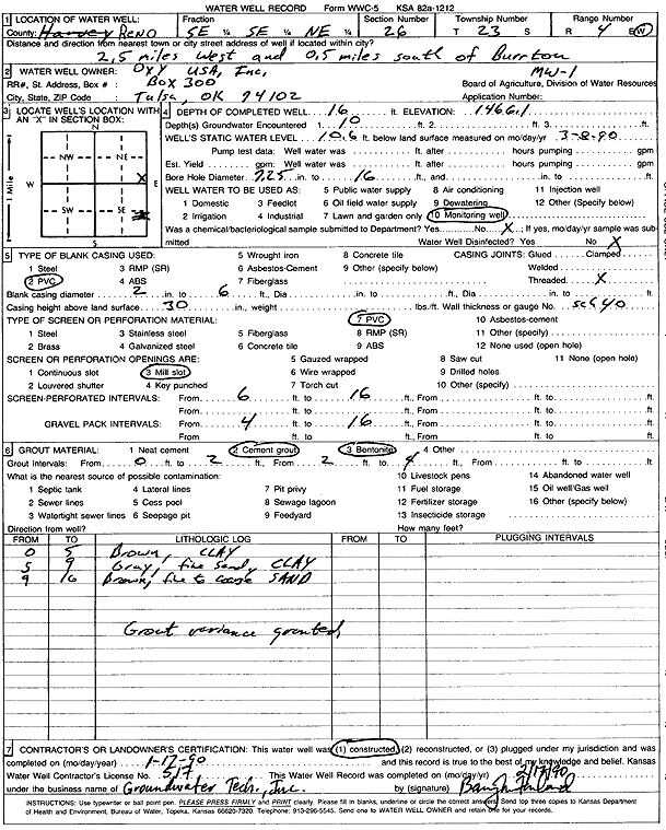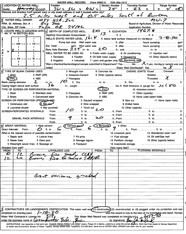 Oxy USA, Inc. | 20 ft. | 12.4 ft. | Monitoring well/observation/piezometer | MW 7 | Constructed | 18-Jan-1990 | Scan | |