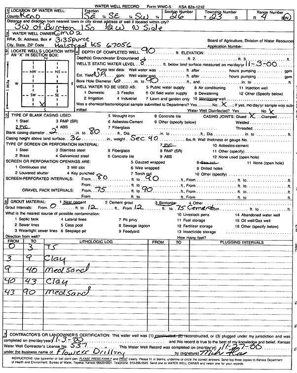 Equus Beds GMD 2 | 90 ft. | 8 ft. | Monitoring well/observation/piezometer | Constructed | 03-Nov-2000 | Scan | ||