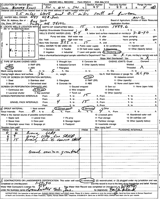 Oxy USA, Inc. | 15 ft. | 4.4 ft. | Monitoring well/observation/piezometer | MW 2 | Constructed | 17-Jan-1990 | Scan | |