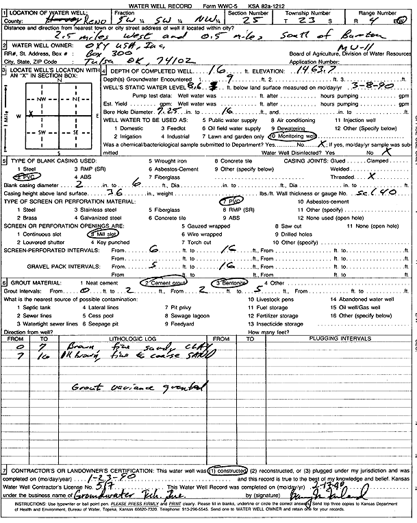 Oxy USA, Inc. | 16 ft. | 8.6 ft. | Monitoring well/observation/piezometer | MW 11 | Constructed | 23-Jan-1990 | Scan | |