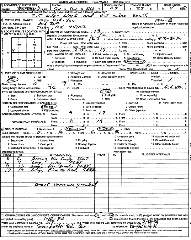 Oxy USA, Inc. | 19 ft. | 12.3 ft. | Monitoring well/observation/piezometer | MW 8 | Constructed | 18-Jan-1990 | Scan | |