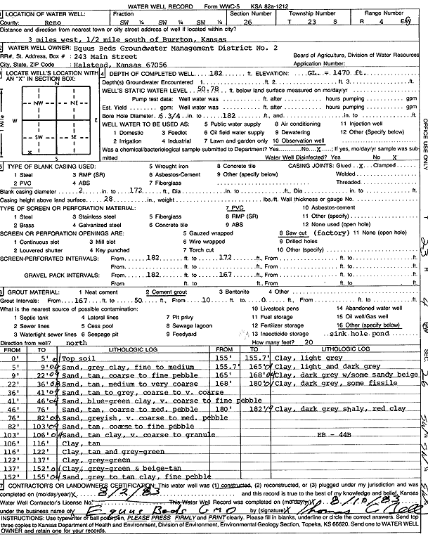 Equus Beds GMD 2 | 182 ft. | 50.78 ft. | Monitoring well/observation/piezometer | EB 44B | Constructed | 02-Aug-1983 | Scan | |