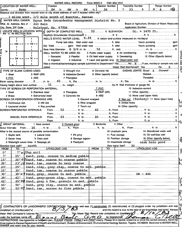 Equus Beds GMD 2 | 52 ft. | 6.44 ft. | Monitoring well/observation/piezometer | EB 44A | Constructed | 03-Aug-1983 | Scan | |