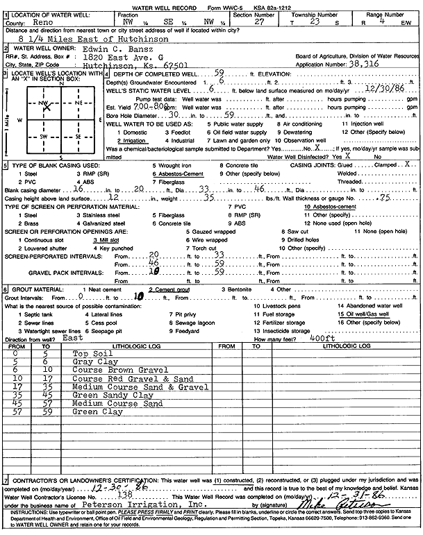 Bansz, Edwin C. | 59 ft. | 6 ft. | 800 gpm. | Irrigation | Constructed | 30-Dec-1986 | Scan | |