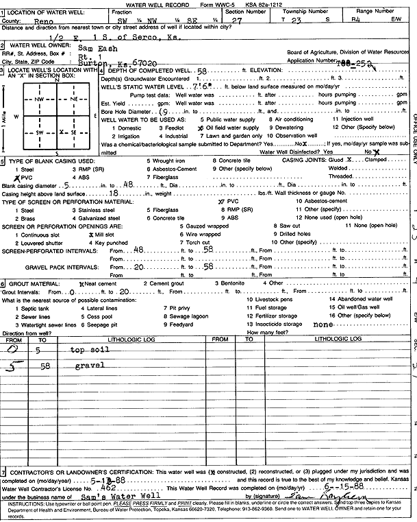 Eash, Sam | 58 ft. | 7.5 ft. | Oil Field Water Supply | Constructed | 18-May-1988 | Scan | ||