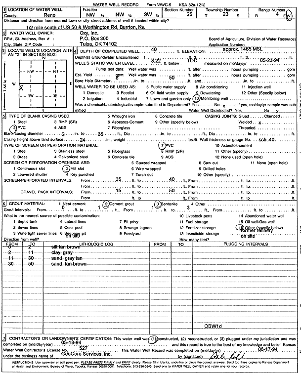 Oxy USA, Inc. | 40 ft. | 8.22 ft. | Monitoring well/observation/piezometer | OBW 1D | Constructed | 18-May-1994 | Scan | |